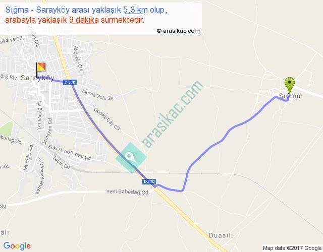 Sığma - Sarayköy arası yaklaşık olarak 90 km/h ile yukarıda belirtilen sürede olup, iki yerin kuş uçuşu uzaklığı (mesafesi) 4'dir. Yolculuk otobüsle 11 dakika sürmektedir.