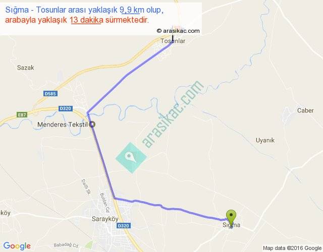 Sığma - Tosunlar arası yaklaşık olarak 90 km/h ile yukarıda belirtilen sürede olup, iki yerin kuş uçuşu uzaklığı (mesafesi) 6'dir. Yolculuk otobüsle 16 dakika sürmektedir.