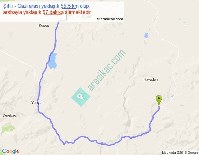Şıhlı - Gazi arası yaklaşık olarak 90 km/h ile yukarıda belirtilen sürede olup, iki yerin kuş uçuşu uzaklığı (mesafesi) 24'dir. Yolculuk otobüsle 1 saat 14 dakika sürmektedir.