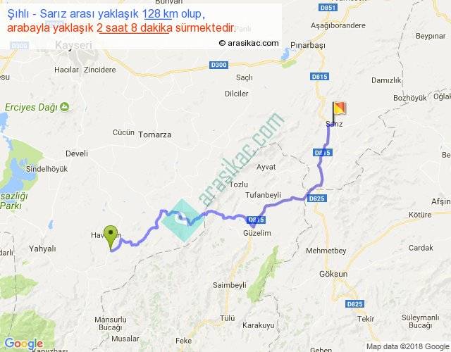 Şıhlı - Sarız arası yaklaşık olarak 90 km/h ile yukarıda belirtilen sürede olup, iki yerin kuş uçuşu uzaklığı (mesafesi) 87'dir. Yolculuk otobüsle 2 saat 46 dakika sürmektedir.