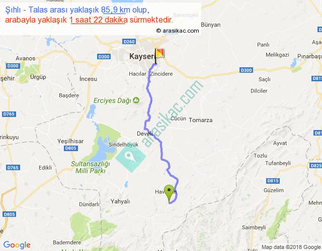 Şıhlı - Talas arası yaklaşık olarak 90 km/h ile yukarıda belirtilen sürede olup, iki yerin kuş uçuşu uzaklığı (mesafesi) 66'dir. Yolculuk otobüsle 1 saat 46 dakika sürmektedir.
