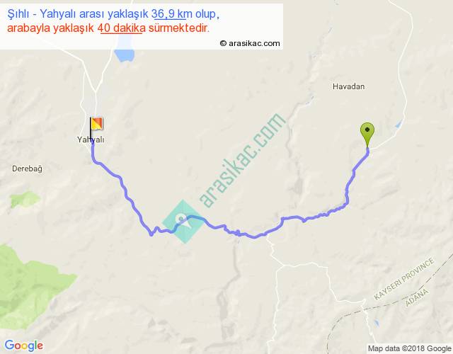 Şıhlı - Yahyalı arası yaklaşık olarak 90 km/h ile yukarıda belirtilen sürede olup, iki yerin kuş uçuşu uzaklığı (mesafesi) 23'dir. Yolculuk otobüsle 52 dakika sürmektedir.