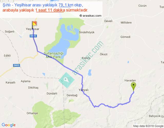 Şıhlı - Yeşilhisar arası yaklaşık olarak 90 km/h ile yukarıda belirtilen sürede olup, iki yerin kuş uçuşu uzaklığı (mesafesi) 55'dir. Yolculuk otobüsle 1 saat 32 dakika sürmektedir.