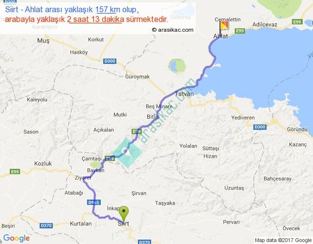 Siirt - Ahlat arası yaklaşık olarak 90 km/h ile yukarıda belirtilen sürede olup, iki yerin kuş uçuşu uzaklığı (mesafesi) 103'dir. Yolculuk otobüsle 2 saat 52 dakika sürmektedir.