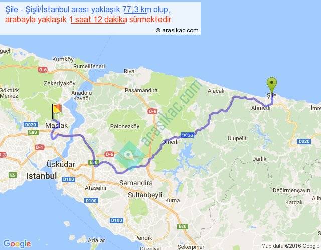 Şile - Şişli İstanbul arası yaklaşık olarak 90 km/h ile yukarıda belirtilen sürede olup, iki yerin kuş uçuşu uzaklığı (mesafesi) 50'dir. Yolculuk otobüsle 1 saat 33 dakika sürmektedir.