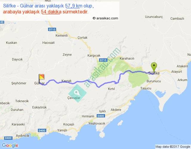 Silifke - Gülnar arası yaklaşık olarak 90 km/h ile yukarıda belirtilen sürede olup, iki yerin kuş uçuşu uzaklığı (mesafesi) 47'dir. Yolculuk otobüsle 1 saat 10 dakika sürmektedir.