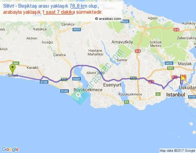 Silivri - Beşiktaş arası yaklaşık olarak 90 km/h ile yukarıda belirtilen sürede olup, iki yerin kuş uçuşu uzaklığı (mesafesi) 63'dir. Yolculuk otobüsle 1 saat 27 dakika sürmektedir.