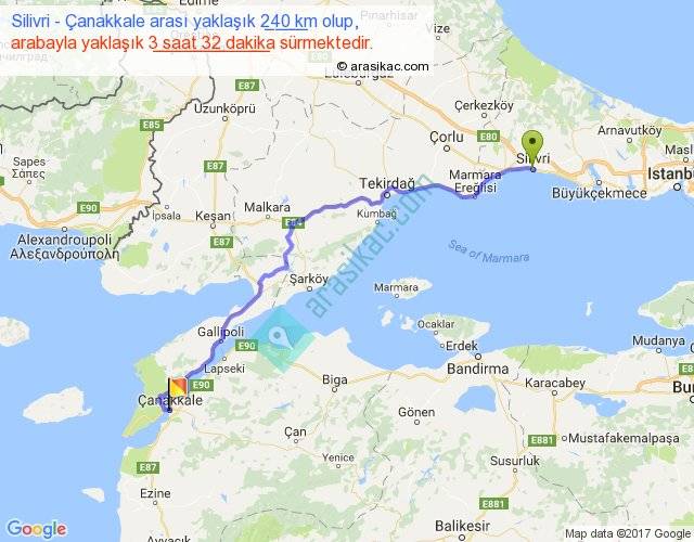 Silivri - Çanakkale arası yaklaşık olarak 90 km/h ile yukarıda belirtilen sürede olup, iki yerin kuş uçuşu uzaklığı (mesafesi) 185'dir. Yolculuk otobüsle 4 saat 35 dakika sürmektedir.