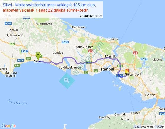 Silivri - Maltepe İstanbul arası yaklaşık olarak 90 km/h ile yukarıda belirtilen sürede olup, iki yerin kuş uçuşu uzaklığı (mesafesi) 79'dir. Yolculuk otobüsle 1 saat 53 dakika sürmektedir.
