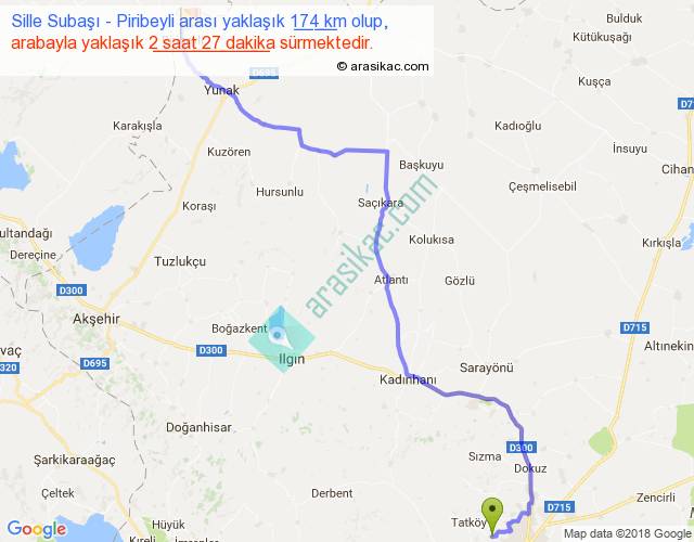 Sille Subaşı - Piribeyli arası yaklaşık olarak 90 km/h ile yukarıda belirtilen sürede olup, iki yerin kuş uçuşu uzaklığı (mesafesi) 128'dir. Yolculuk otobüsle 3 saat 11 dakika sürmektedir.