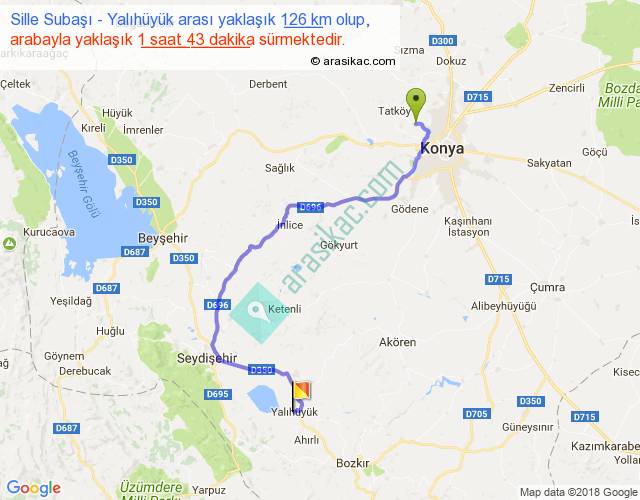 Sille Subaşı - Yalıhüyük arası yaklaşık olarak 90 km/h ile yukarıda belirtilen sürede olup, iki yerin kuş uçuşu uzaklığı (mesafesi) 75'dir. Yolculuk otobüsle 2 saat 13 dakika sürmektedir.