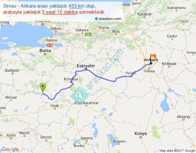 Simav - Ankara arası yaklaşık olarak 90 km/h ile yukarıda belirtilen sürede olup, iki yerin kuş uçuşu uzaklığı (mesafesi) 344'dir. Eğer belirtilen yerler arasında uçak seferi var ise bu süre uçakla 31 dakika'ya kadar düşebilir. Yolculuk otobüsle 6 saat 49 dakika sürmektedir.