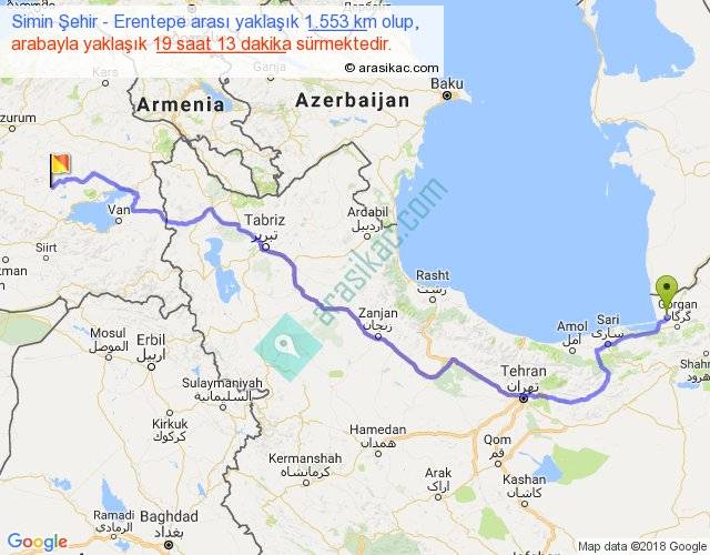 Simin Şehir - Erentepe arası yaklaşık olarak 90 km/h ile yukarıda belirtilen sürede olup, iki yerin kuş uçuşu uzaklığı (mesafesi) 1082'dir. Eğer belirtilen yerler arasında uçak seferi var ise bu süre uçakla 1 saat 39 dakika'ya kadar düşebilir. Yolculuk otobüsle 1 gün 0 saat sürmektedir.