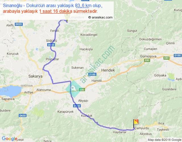 Sinanoğlu - Dokurcun arası yaklaşık olarak 90 km/h ile yukarıda belirtilen sürede olup, iki yerin kuş uçuşu uzaklığı (mesafesi) 51'dir. Yolculuk otobüsle 1 saat 38 dakika sürmektedir.