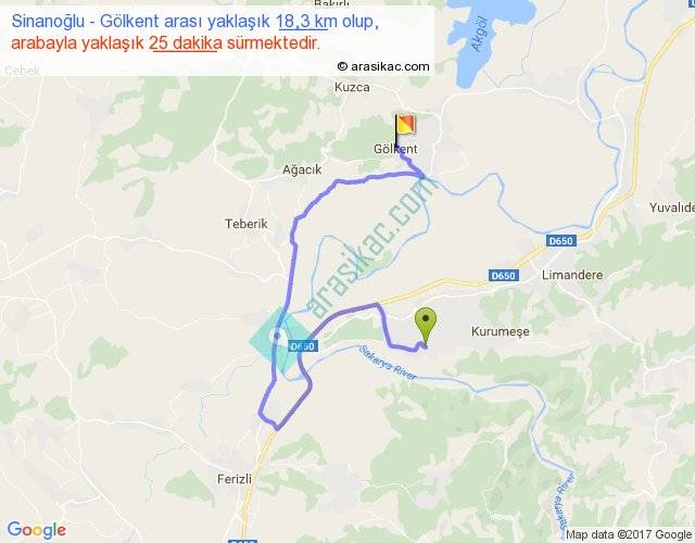 Sinanoğlu - Gölkent arası yaklaşık olarak 90 km/h ile yukarıda belirtilen sürede olup, iki yerin kuş uçuşu uzaklığı (mesafesi) 5'dir. Yolculuk otobüsle 32 dakika sürmektedir.