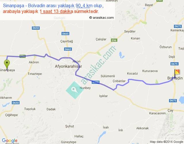 Sinanpaşa - Bolvadin arası yaklaşık olarak 90 km/h ile yukarıda belirtilen sürede olup, iki yerin kuş uçuşu uzaklığı (mesafesi) 69'dir. Yolculuk otobüsle 1 saat 34 dakika sürmektedir.