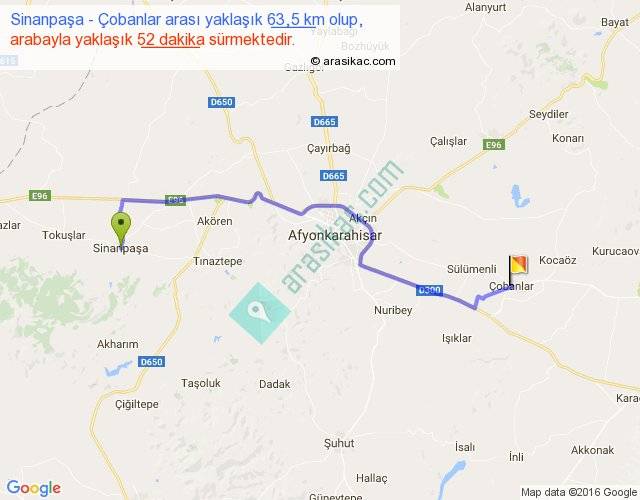Sinanpaşa - Çobanlar arası yaklaşık olarak 90 km/h ile yukarıda belirtilen sürede olup, iki yerin kuş uçuşu uzaklığı (mesafesi) 47'dir. Yolculuk otobüsle 1 saat 7 dakika sürmektedir.