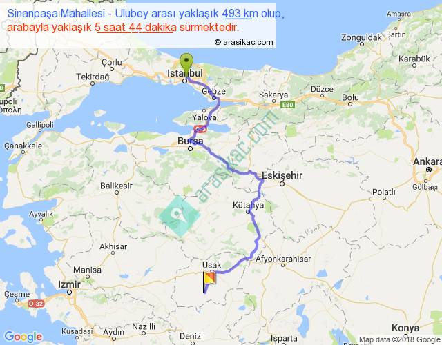 Sinanpaşa Mahallesi - Ulubey arası yaklaşık olarak 90 km/h ile yukarıda belirtilen sürede olup, iki yerin kuş uçuşu uzaklığı (mesafesi) 291'dir. Eğer belirtilen yerler arasında uçak seferi var ise bu süre uçakla 26 dakika'ya kadar düşebilir. Yolculuk otobüsle 7 saat 27 dakika sürmektedir.