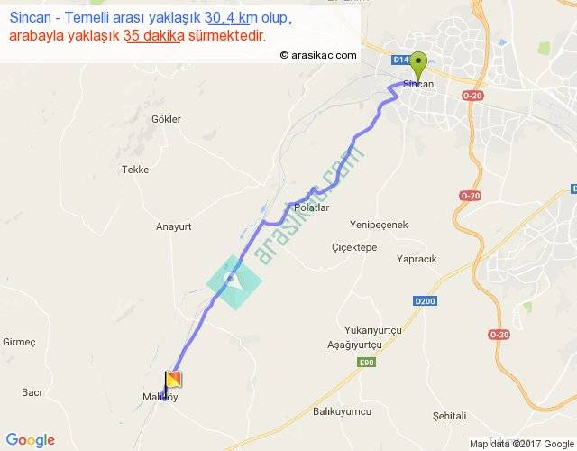 Sincan - Temelli arası yaklaşık olarak 90 km/h ile yukarıda belirtilen sürede olup, iki yerin kuş uçuşu uzaklığı (mesafesi) 26'dir. Yolculuk otobüsle 45 dakika sürmektedir.