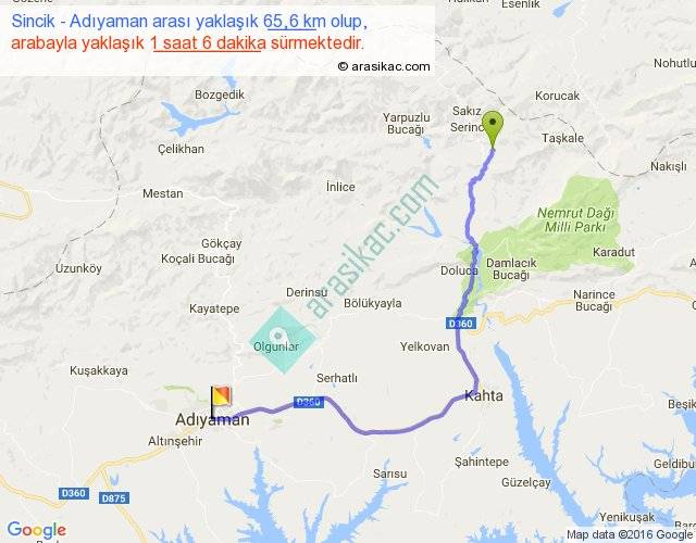Sincik - Adıyaman arası yaklaşık olarak 90 km/h ile yukarıda belirtilen sürede olup, iki yerin kuş uçuşu uzaklığı (mesafesi) 43'dir. Yolculuk otobüsle 1 saat 25 dakika sürmektedir.
