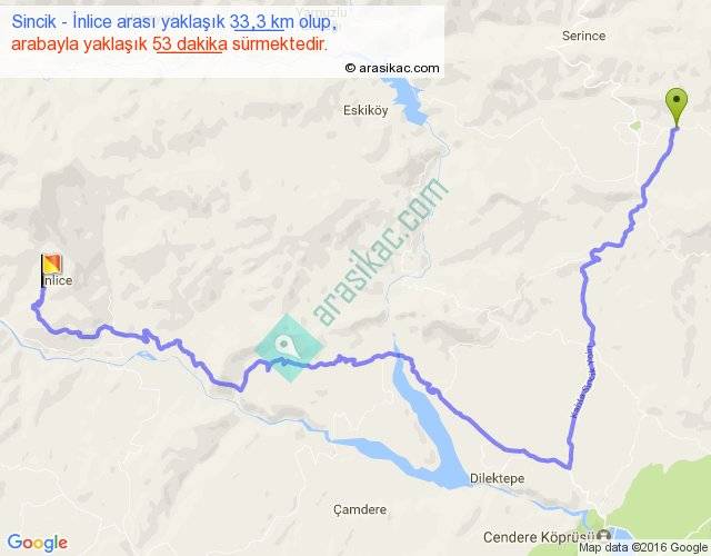 Sincik - İnlice arası yaklaşık olarak 90 km/h ile yukarıda belirtilen sürede olup, iki yerin kuş uçuşu uzaklığı (mesafesi) 18'dir. Yolculuk otobüsle 1 saat 8 dakika sürmektedir.