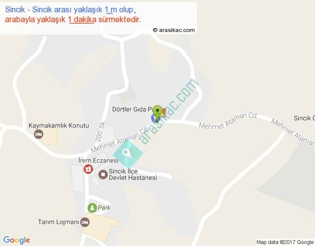 Sincik - Sincik arası yaklaşık olarak 90 km/h ile yukarıda belirtilen sürede olup, iki yerin kuş uçuşu uzaklığı (mesafesi) 0'dir. Yolculuk otobüsle 1 dakika sürmektedir.