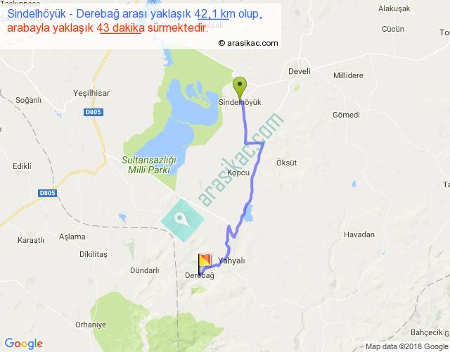 Sindelhöyük - Derebağ arası yaklaşık olarak 90 km/h ile yukarıda belirtilen sürede olup, iki yerin kuş uçuşu uzaklığı (mesafesi) 30'dir. Yolculuk otobüsle 55 dakika sürmektedir.