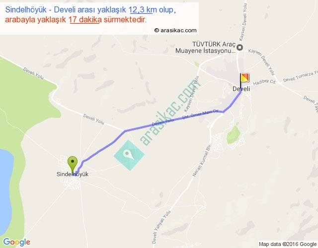 Sindelhöyük - Develi arası yaklaşık olarak 90 km/h ile yukarıda belirtilen sürede olup, iki yerin kuş uçuşu uzaklığı (mesafesi) 11'dir. Yolculuk otobüsle 22 dakika sürmektedir.