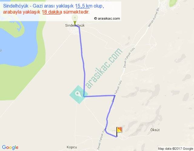 Sindelhöyük - Gazi arası yaklaşık olarak 90 km/h ile yukarıda belirtilen sürede olup, iki yerin kuş uçuşu uzaklığı (mesafesi) 12'dir. Yolculuk otobüsle 23 dakika sürmektedir.