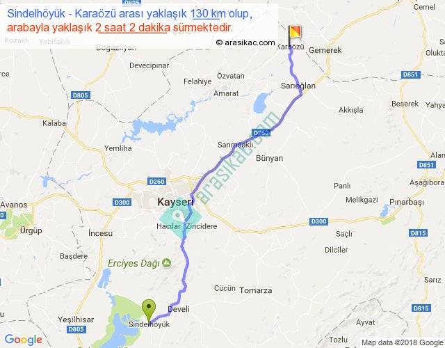 Sindelhöyük - Karaözü arası yaklaşık olarak 90 km/h ile yukarıda belirtilen sürede olup, iki yerin kuş uçuşu uzaklığı (mesafesi) 106'dir. Yolculuk otobüsle 2 saat 38 dakika sürmektedir.