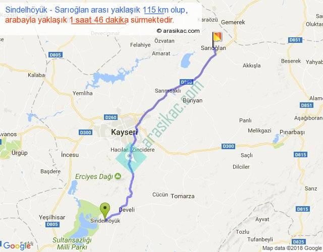 Sindelhöyük - Sarıoğlan arası yaklaşık olarak 90 km/h ile yukarıda belirtilen sürede olup, iki yerin kuş uçuşu uzaklığı (mesafesi) 96'dir. Yolculuk otobüsle 2 saat 17 dakika sürmektedir.