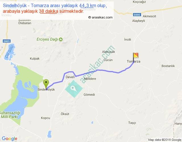 Sindelhöyük - Tomarza arası yaklaşık olarak 90 km/h ile yukarıda belirtilen sürede olup, iki yerin kuş uçuşu uzaklığı (mesafesi) 38'dir. Yolculuk otobüsle 49 dakika sürmektedir.