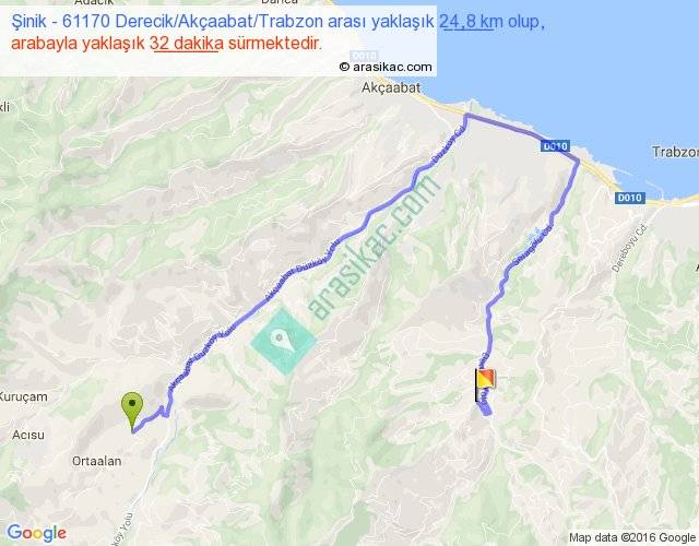 Şinik - 61170 Derecik Akçaabat Trabzon arası yaklaşık olarak 90 km/h ile yukarıda belirtilen sürede olup, iki yerin kuş uçuşu uzaklığı (mesafesi) 9'dir. Yolculuk otobüsle 41 dakika sürmektedir.