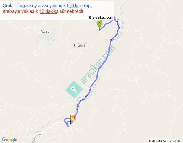 Şinik - Doğanköy arası yaklaşık olarak 90 km/h ile yukarıda belirtilen sürede olup, iki yerin kuş uçuşu uzaklığı (mesafesi) 5'dir. Yolculuk otobüsle 15 dakika sürmektedir.