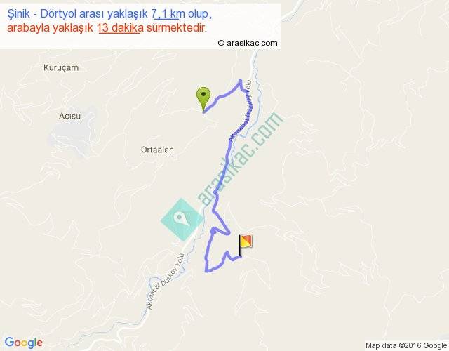 Şinik - Dörtyol arası yaklaşık olarak 90 km/h ile yukarıda belirtilen sürede olup, iki yerin kuş uçuşu uzaklığı (mesafesi) 3'dir. Yolculuk otobüsle 16 dakika sürmektedir.