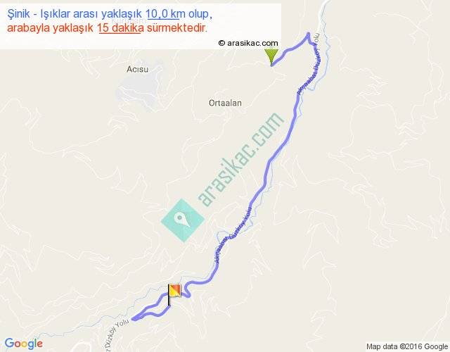 Şinik - Işıklar arası yaklaşık olarak 90 km/h ile yukarıda belirtilen sürede olup, iki yerin kuş uçuşu uzaklığı (mesafesi) 5'dir. Yolculuk otobüsle 19 dakika sürmektedir.