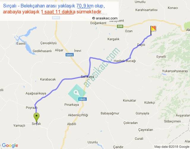Sırçalı - Belekçahan arası yaklaşık olarak 90 km/h ile yukarıda belirtilen sürede olup, iki yerin kuş uçuşu uzaklığı (mesafesi) 57'dir. Yolculuk otobüsle 1 saat 32 dakika sürmektedir.