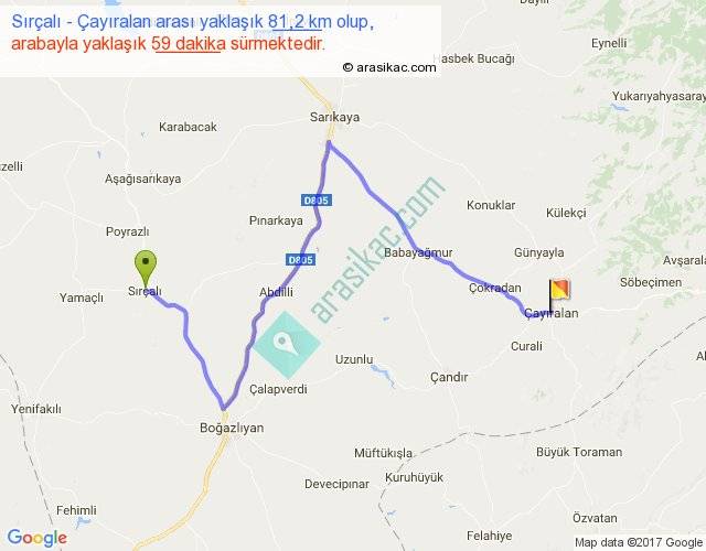 Sırçalı - Çayıralan arası yaklaşık olarak 90 km/h ile yukarıda belirtilen sürede olup, iki yerin kuş uçuşu uzaklığı (mesafesi) 43'dir. Yolculuk otobüsle 1 saat 16 dakika sürmektedir.