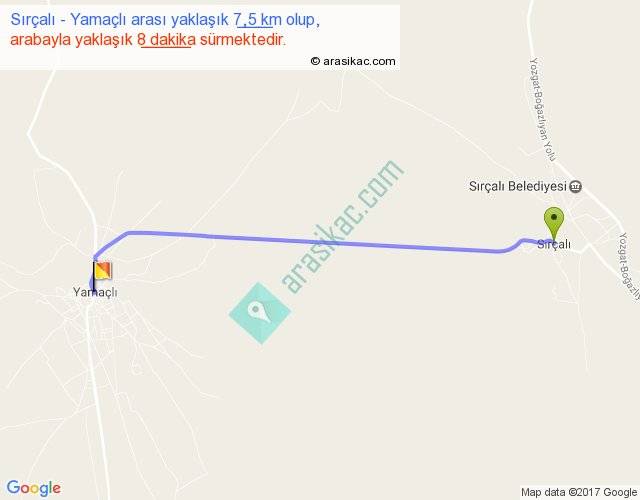 Sırçalı - Yamaçlı arası yaklaşık olarak 90 km/h ile yukarıda belirtilen sürede olup, iki yerin kuş uçuşu uzaklığı (mesafesi) 7'dir. Yolculuk otobüsle 10 dakika sürmektedir.