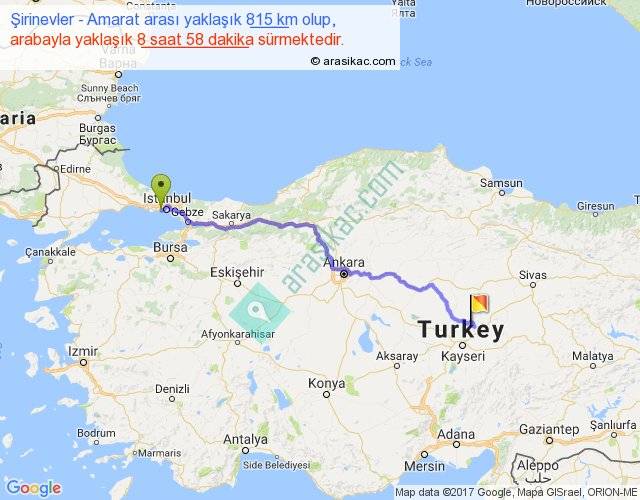 Şirinevler - Amarat arası yaklaşık olarak 90 km/h ile yukarıda belirtilen sürede olup, iki yerin kuş uçuşu uzaklığı (mesafesi) 616'dir. Eğer belirtilen yerler arasında uçak seferi var ise bu süre uçakla 56 dakika'ya kadar düşebilir. Yolculuk otobüsle 11 saat 39 dakika sürmektedir.