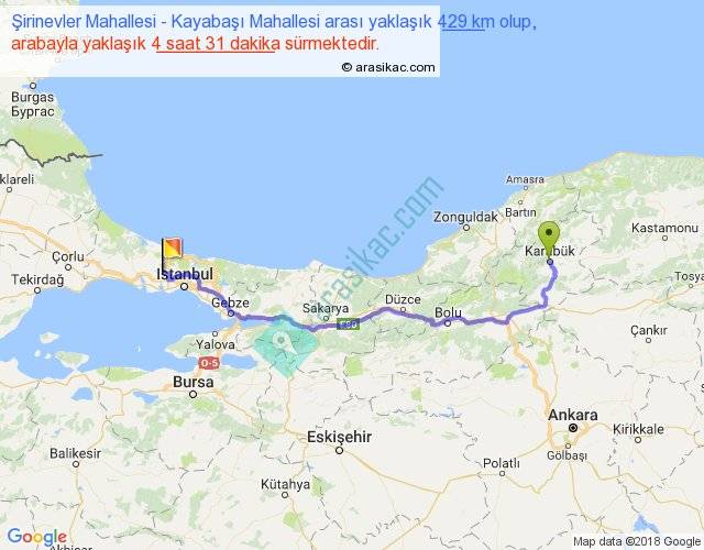 Şirinevler Mahallesi - Kayabaşı Mahallesi arası yaklaşık olarak 90 km/h ile yukarıda belirtilen sürede olup, iki yerin kuş uçuşu uzaklığı (mesafesi) 320'dir. Eğer belirtilen yerler arasında uçak seferi var ise bu süre uçakla 29 dakika'ya kadar düşebilir. Yolculuk otobüsle 5 saat 52 dakika sürmektedir.