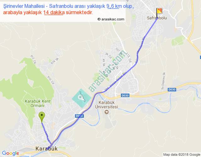 Şirinevler Mahallesi - Safranbolu arası yaklaşık olarak 90 km/h ile yukarıda belirtilen sürede olup, iki yerin kuş uçuşu uzaklığı (mesafesi) 7'dir. Yolculuk otobüsle 18 dakika sürmektedir.