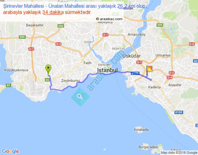 Şirinevler Mahallesi - Ünalan Mahallesi arası yaklaşık olarak 90 km/h ile yukarıda belirtilen sürede olup, iki yerin kuş uçuşu uzaklığı (mesafesi) 18'dir. Yolculuk otobüsle 44 dakika sürmektedir.