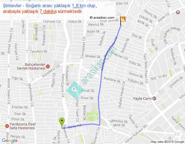 Şirinevler - Soğanlı arası yaklaşık olarak 90 km/h ile yukarıda belirtilen sürede olup, iki yerin kuş uçuşu uzaklığı (mesafesi) 1'dir. Yolculuk otobüsle 9 dakika sürmektedir.