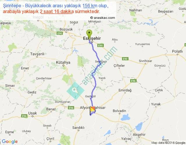 Şirintepe - Büyükkalecik arası yaklaşık olarak 90 km/h ile yukarıda belirtilen sürede olup, iki yerin kuş uçuşu uzaklığı (mesafesi) 122'dir. Yolculuk otobüsle 2 saat 56 dakika sürmektedir.