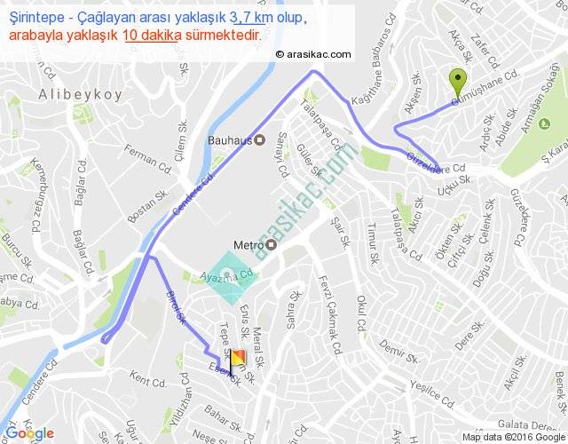 Şirintepe - Çağlayan arası yaklaşık olarak 90 km/h ile yukarıda belirtilen sürede olup, iki yerin kuş uçuşu uzaklığı (mesafesi) 1'dir. Yolculuk otobüsle 13 dakika sürmektedir.