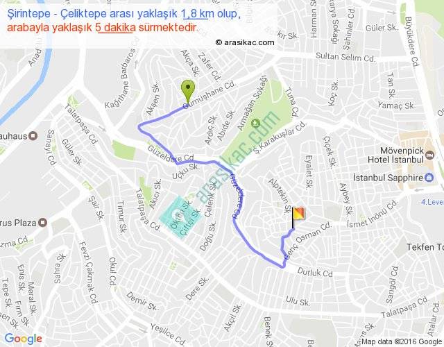 Şirintepe - Çeliktepe arası yaklaşık olarak 90 km/h ile yukarıda belirtilen sürede olup, iki yerin kuş uçuşu uzaklığı (mesafesi) 1'dir. Yolculuk otobüsle 6 dakika sürmektedir.