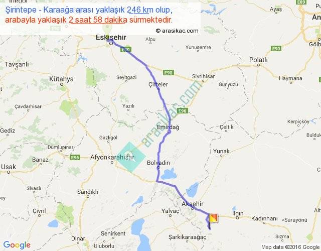 Şirintepe - Karaağa arası yaklaşık olarak 90 km/h ile yukarıda belirtilen sürede olup, iki yerin kuş uçuşu uzaklığı (mesafesi) 202'dir. Yolculuk otobüsle 3 saat 51 dakika sürmektedir.