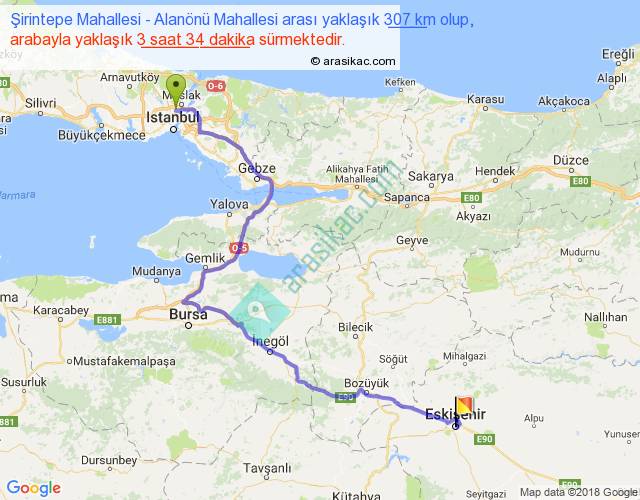 Şirintepe Mahallesi - Alanönü Mahallesi arası yaklaşık olarak 90 km/h ile yukarıda belirtilen sürede olup, iki yerin kuş uçuşu uzaklığı (mesafesi) 196'dir. Yolculuk otobüsle 4 saat 38 dakika sürmektedir.