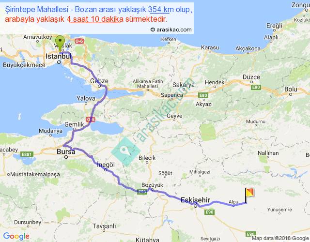 Şirintepe Mahallesi - Bozan arası yaklaşık olarak 90 km/h ile yukarıda belirtilen sürede olup, iki yerin kuş uçuşu uzaklığı (mesafesi) 228'dir. Yolculuk otobüsle 5 saat 25 dakika sürmektedir.